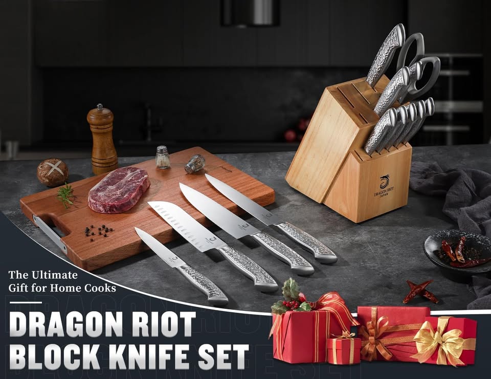 14PCS Knife Block Set — The Set includes 8″ Chef Knife, 8″ Bread Knife, 8″ Slicing Knife, 7″ Santoku Knife, 5″ Utility Knife, 3.5″ Paring Knife, 4.5″ Steak Knives Set of 6, Kitchen Scissor and Solid Wood Block with build in Knife Sharpener. Ultra Sharp Blades for Effortless Cutting — Crafted from high quality full stainless steel, this 14 piece knife block set features exceptionally sharp blades. Each blade is precisely honed to a fine edge (12-14°V-shaped), allowing for smooth and precise cutting of various foods. The advanced steel blend ensures long lasting sharpness, making your cooking process more efficient and enjoyable. Full Metal Design, Dishwasher Safe — The full metal design of this knife set makes it dishwasher safe, perfect for those who prefer convenience. The ergonomically designed handle is not only visually appealing but also provides a non-slip grip. The stainless steel knife is well-balanced and lightweight, ensuring comfort even during extended use without causing fatigue. Solid Knife Block — Our knife set features a wood block made from natural wood, free from any coatings for a healthy and safe storage solution. The block is designed with a sleek, angled structure that makes it easy to access each knife. Its non-slip base ensures stability and prevents tipping, even during frequent use. Built-In Knife Sharpener — The block features an integrated sharpener, ensuring your blades stay razor-sharp with minimal effort, allowing you to maintain perfect cuts every time. Simply place your knives back in the block, and the sharpener automatically restores their edge, making this set ideal for those who want convenience and optimal performance without needing additional sharpening tools. PG 72