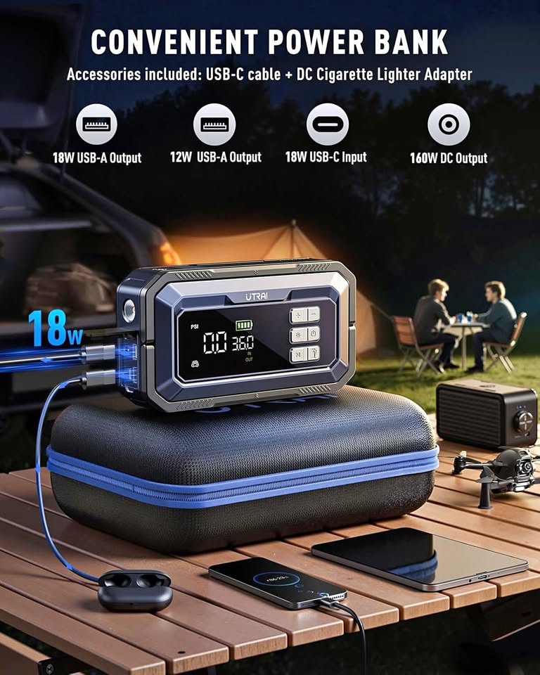 【7000A PEAK POWER & BOOST MODE】The JS-30 advanced car battery booster delivers an impressive 7000A peak current, powerful enough to start all 12V vehicles and hybrid cars – from sedans, SUVs, pickups, motorcycles, ATVs, RVs, boats, to diesel engines up to 12L. The BOOST mode ensures reliable ignition even for completely dead batteries, so you’ll never be stranded. This car jump starter foldable handle makes it easy to carry, while also allowing the device to hang outdoors as an emergency lamp. Compact, versatile, and always ready for roadside emergencies or adventures. ⚙️【150PSI AIR COMPRESSOR & MULTI-PURPOSE NOZZLES】Equipped with a 19-cylinder high-performance motor, this jump starter booster pack doubles as a cordless tire inflator delivering up to 150PSI for rapid tire inflation. Effortlessly inflate car, motorcycle, e-bike, and bicycle tires, as well as balls, lifebuoys, and other inflatables. This car booster battery pack come with 4 interchangeable nozzles, it covers all your daily and emergency inflation needs. Smart preset and auto shut-off functions ensure accurate inflation with no guesswork. 💡【2000-LUMEN ROTATABLE FLOODLIGHT & SPOTLIGHT】Unlike ordinary jump starters, the JS-30 car booster battery pack integrates a 90° rotatable floodlight panel reaching up to 2000 lumens for wide-area illumination. Features 4 light modes: flashlight, strobe, SOS, and red warning flash, plus an additional spotlight for close-up tasks like tire checks or engine inspection. The battery booster’s red flash doubles as a roadside warning signal, ensuring your safety during nighttime breakdowns. 🔋【REAL 16000mAh CAPACITY & VERSATILE POWER BANK】This car jump starter battery booster provides a true 16000mAh capacity. Dual USB ports keep your phones, tablets, and cameras charged on the go, while the booster pack/jump starter 160W DC output (with EC5 adapter included) powers 12V appliances such as car refrigerators, mini air pumps, and vacuum cleaners. Whether camping, traveling, or facing roadside emergencies, UTRAI JS-30 car booster battery charger is your reliable portable power station. 🛠【OBD II DIAGNOSTIC TOOL INCLUDED】More than a booster jump starter – it’s also your intelligent car doctor. The jump starter battery pack included a OBD II scanner reads fault codes to quickly pinpoint issues like oxygen sensor failures, helping prevent costly repairs. Real-time monitoring of engine, catalytic converter, and other key components provides emission warnings and fuel consumption analysis, helping you optimize driving habits and reduce risks. (Note: To use this function, you have to connect the OBDII scanner in the accessories to the car’s OBD port and download the corresponding APP for testing). 🦺【10 SAFETY PROTECTIONS & V0 FIREPROOF MATERIAL】Built with durable V0-rated flame-retardant material and intelligent safety chips, this booster pack car starter automatically applies 10 layers of protection: over-discharge, reverse polarity, spark-proof, short-circuit, overcharge, overpower, overcurrent, overvoltage, overheating, and extreme temperature safeguards. Safe and reliable for every jump start, charge, and inflation. 📦【COMPLETE CAR EMERGENCY KIT & 24-MONTH WARRANTY】Everything you need in one kit: JS-30 car jump starter with air compressor x1, air hose x1, smart booster cables x1, OBD II scanner x1, DC adapter x1, USB-C cable x1, 4 inflation nozzles x1, insulated gloves x1, EVA protective case x1, and user manual x1. Backed by a 24-month worry-free warranty and lifetime support – ensuring peace of mind for all your journeys. PG 607