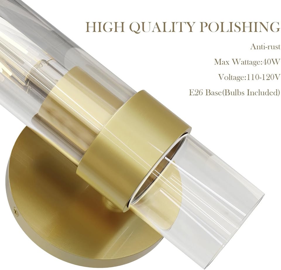 【Superior Quality Materials & High Quality Polishing】The wall sconce lighting decor set of 2 feature a full metal body, ensuring safety and durability for long-term use.Additionally, the upgraded surface treatment not only adds an elegant touch but also includes scratch-resistant and stain-resistant coatings, ensuring that the interior wall sconce can maintain its pristine appearance for an extended period.this golden brass –has been treated to prevent oxiddation over time. Vibrant and bright ,a lustrous sheen with a high level of refectivity results in a modern glam appearance that won’t fade or tarnish . 【Clean and Adaptable Design】:These 2-pack bathroom sconces wall sconces offer an elegant and rustic look, suitable for indoor use as vanity lights, bathroom lighting over mirrors, and bedroom bedside wall light fixtures. It is an excellent choice for your bathroom mirror or bedroom, living room, dressing table, vanity table, mirror cabinets, doorway or entryway, corridor, foyer, bar coffee shop.. Elevate the atmosphere of your home and other spaces with this stylish and adaptable lighting solution. 【2 T10 Bulbs Included & E26 Heat-Resistant Sockets 】: Featuring heat-resistant ceramic sockets, the wall sconce lights are designed to withstand the heat from prolonged bulb use, reducing the frequency of bulb replacements and providing a cost-effective, durable lighting solution.Warm tips: In addition to using the T10 bulbs we offered, if you have T14 bulbs at home, they are also suitable for use. 【Easy Installation】Hardwired. The wall sconce set of 2 fixtures just need to connect the wire, then place the bulb and glass shade. No on/off switch& plug. The glass wall sconces are suitable for US standard junction box. The necessary accessories required for installation are included in the package. PG 390