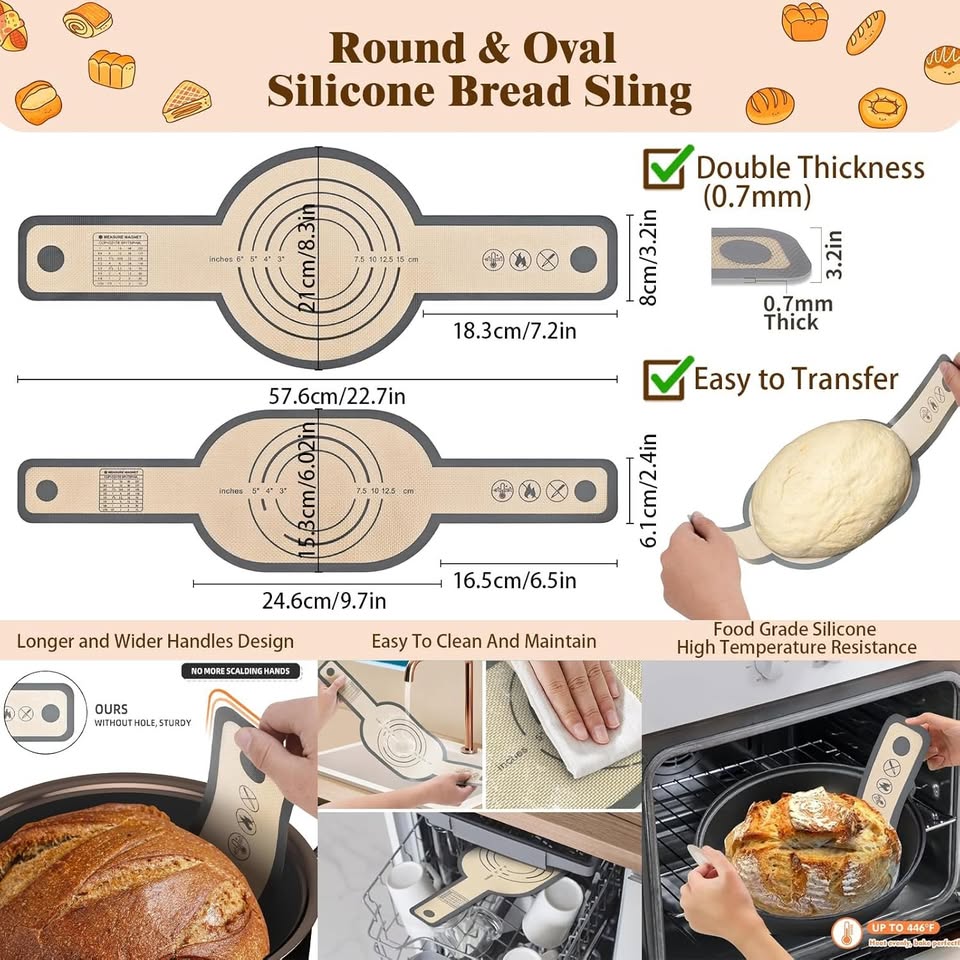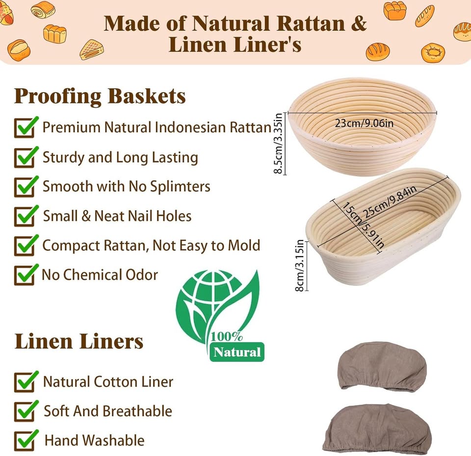 Complete Sourdough Baking Essentials: Simplify your artisan bread journey with an all-in-one kit covering every step—from feeding your sourdough starter to scoring designs. Includes 9-inch round & 10-inch oval banneton proofing baskets, dough scrapers, bread scoring tools, and a sourdough starter jar with date bands—perfect for beginners and seasoned bakers Premium Natural & Safe Materials: Crafted with 100% natural rattan banneton baskets (no dyes or chemicals) and food-grade silicone slings, our bread proofing tools ensure safe, even fermentation and crispy crusts. Durable stainless steel scrapers and heat-resistant accessories elevate your sourdough baking supplies Effortless to Use & Clean: Designed for hassle-free bread proofing, the banneton baskets feature removable liners and smooth surfaces for easy dough release. Quick-clean materials and a flour duster keep your kitchen tidy, while the scoring blades guarantee bakery-worthy designs every time What Will You Get: A complete sourdough bread toolkit with 2 proofing baskets, 2 silicone slings, 5-blade scoring tool, dough whisk, scrapers, spatulas, stencils, and more. Perfect for crafting bread bowls, boules, or sourdough loaves—no extra bread making tools required Ideal Gift for Bread Enthusiasts: This complete sourdough starter kit cultivates culinary creativity, offering bakers, moms, and homesteaders everything needed to craft artisanal loaves. A heartfelt present for birthdays, holidays, or new home celebrations, it transforms kitchens into bakeries where memories are kneaded into every warm, crusty creation shared with family and friends PG 404